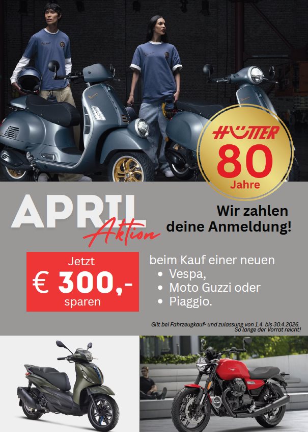 Sichere dir jetzt im April € 300,- Anmeldegebühr bei Neufahrzeugen von Vespa, Moto Guzzi und Piaggio und TOP Konditionen sowie einen € 100,- Tankgutschein bei Finanzierung mit Santander!